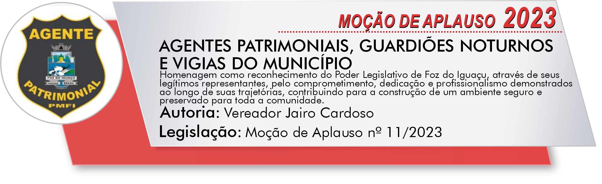 Homenagem como reconhecimento do Poder Legislativo de Foz do Iguaçu, através de seus legítimos representantes, pelo comprometimento, dedicação e profissionalismo demonstrados ao longo de suas trajetórias, contribuindo para a construção de um ambiente seguro e preservado para toda a comunidade.