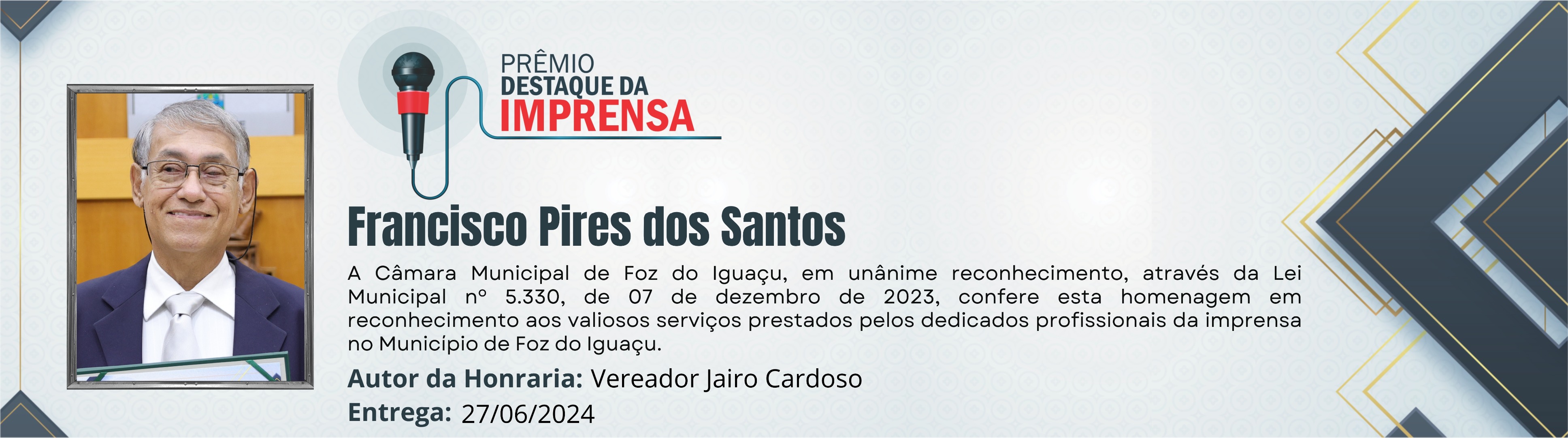 A Câmara Municipal de Foz do Iguaçu, em unânime reconhecimento, através da Lei Municipal nº 5.330, de 07 de dezembro de 2023, confere esta homenagem em reconhecimento aos valiosos serviços prestados pelos dedicados profissionais da imprensa no Município de Foz do Iguaçu.