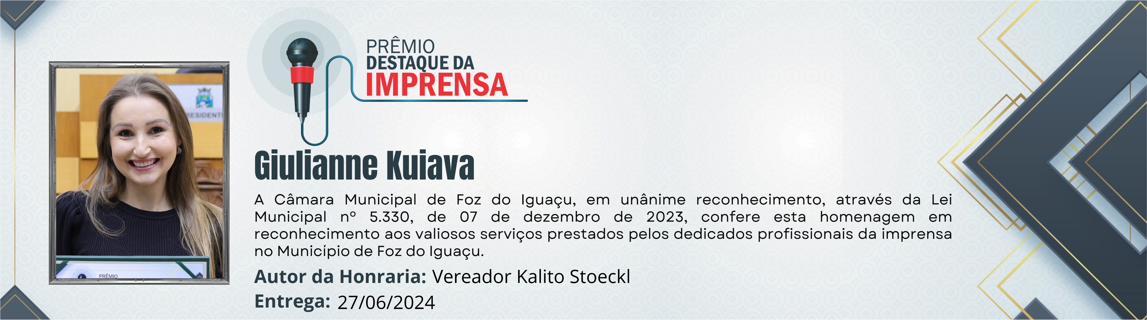 A Câmara Municipal de Foz do Iguaçu, em unânime reconhecimento, através da Lei Municipal nº 5.330, de 07 de dezembro de 2023, confere esta homenagem em reconhecimento aos valiosos serviços prestados pelos dedicados profissionais da imprensa no Município de Foz do Iguaçu.
