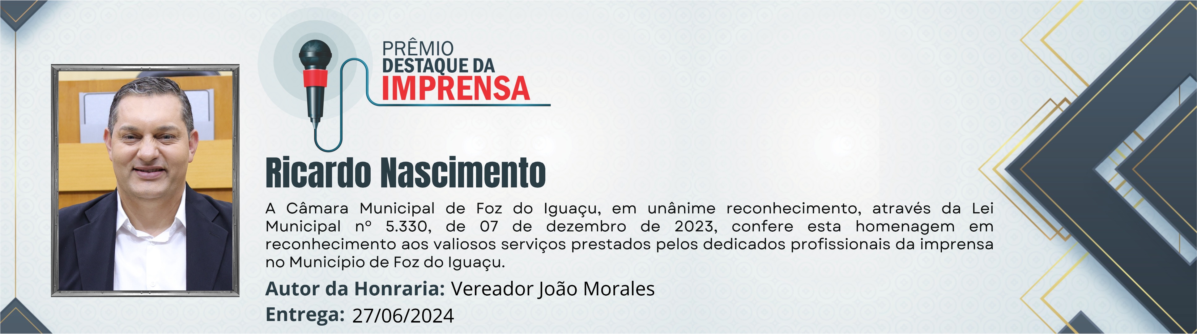 A Câmara Municipal de Foz do Iguaçu, em unânime reconhecimento, através da Lei Municipal nº 5.330, de 07 de dezembro de 2023, confere esta homenagem em reconhecimento aos valiosos serviços prestados pelos dedicados profissionais da imprensa no Município de Foz do Iguaçu.