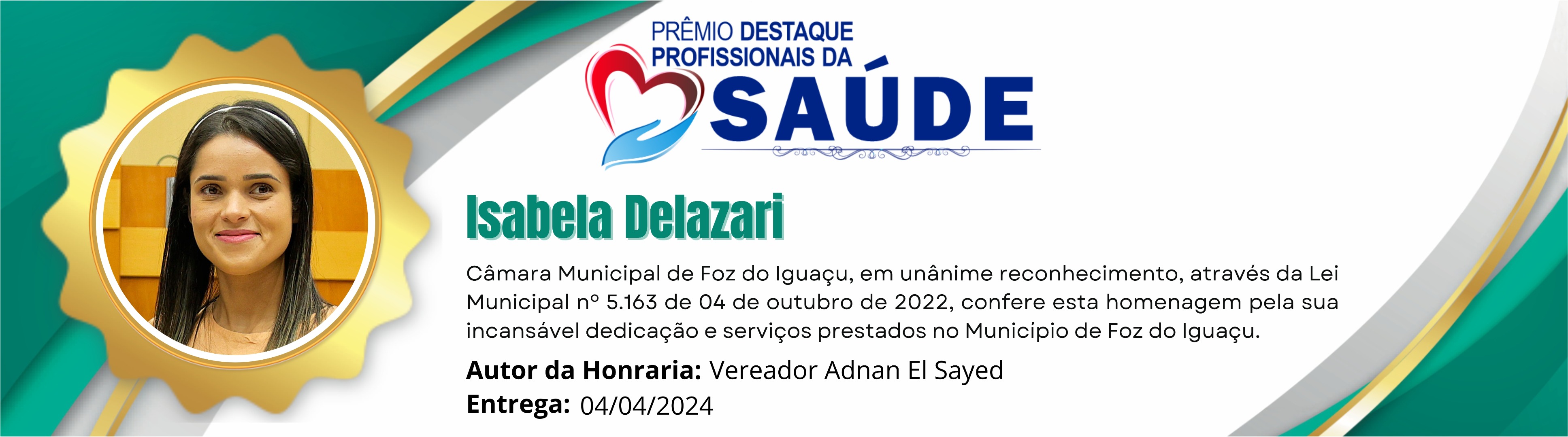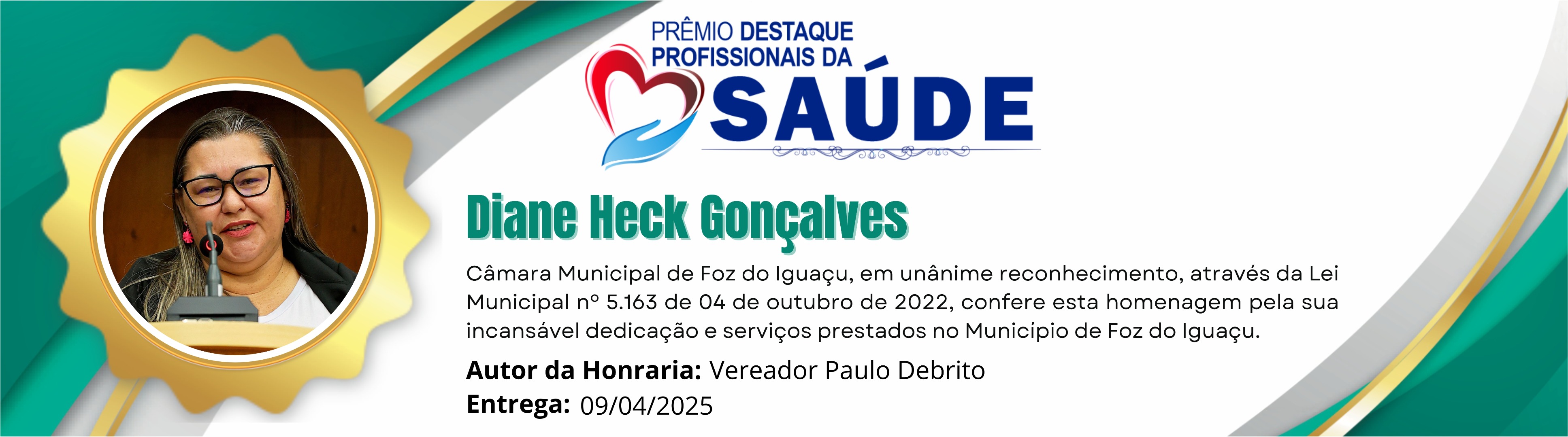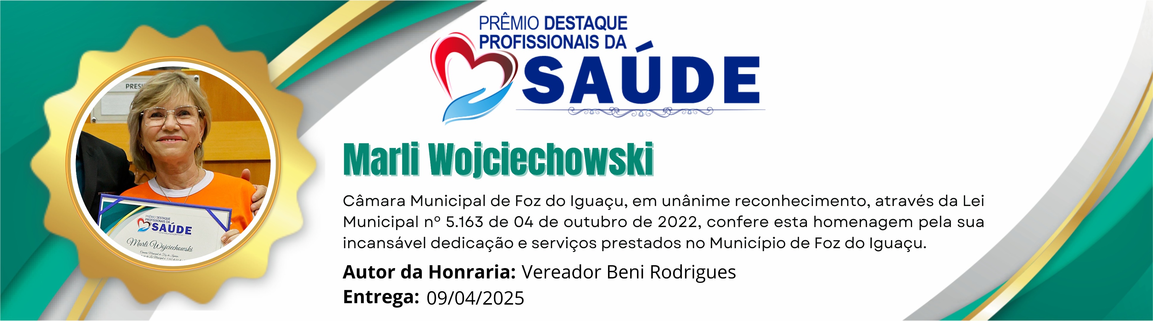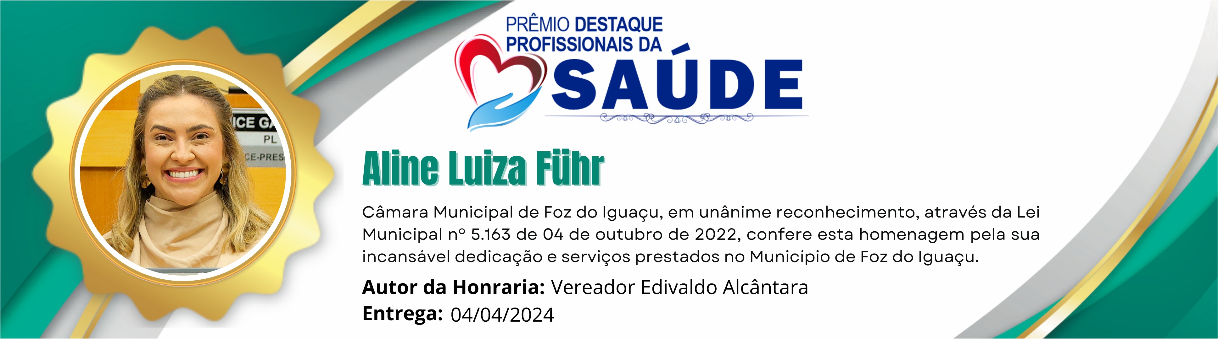 Câmara Municipal de Foz do Iguaçu, em unânime reconhecimento, através da Lei Municipal nº 5.163 de 04 de outubro de 2022, confere esta homenagem pela incansável dedicação e serviços prestados no Município de Foz do Iguaçu.