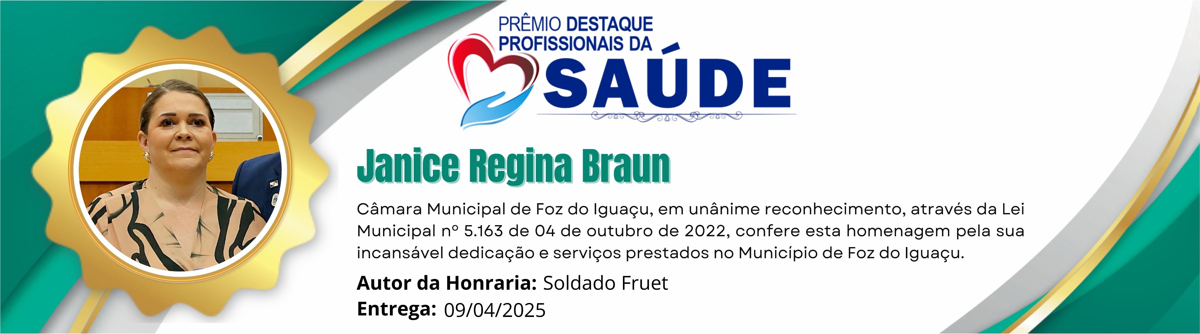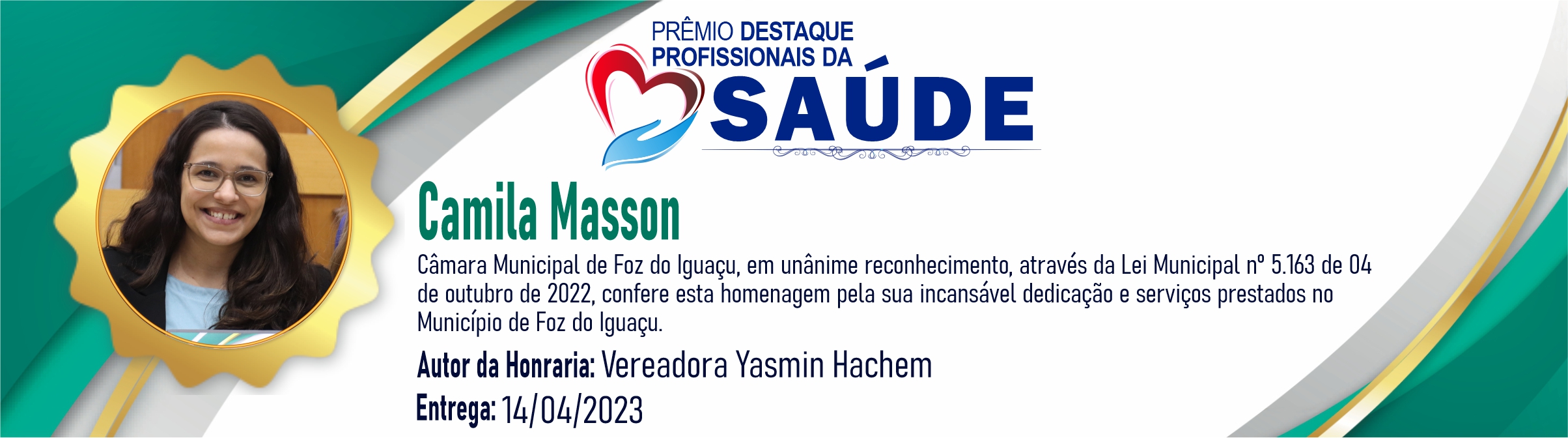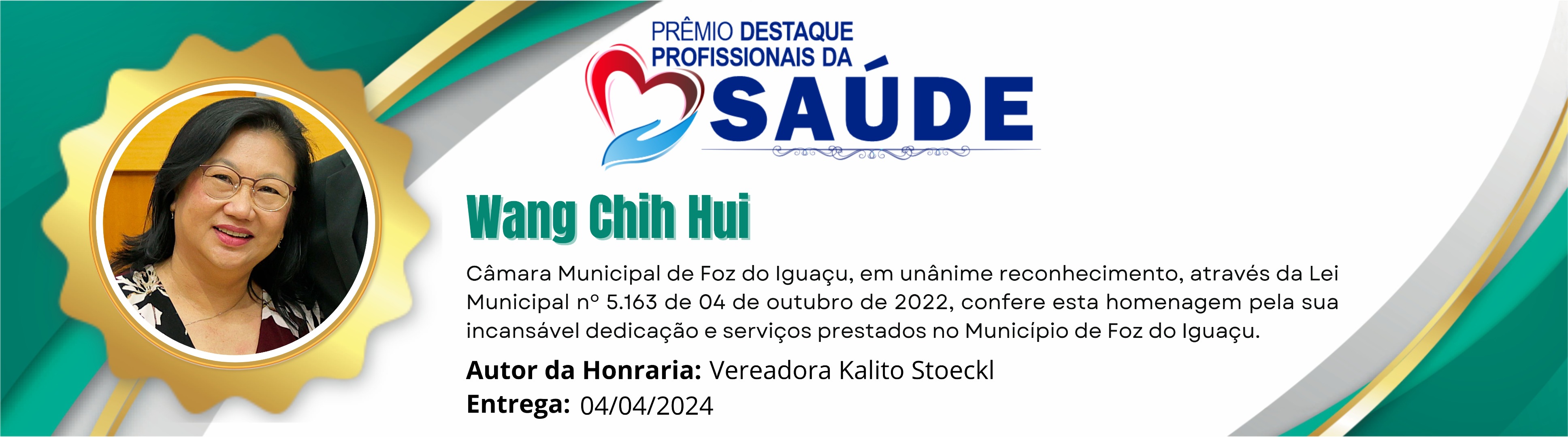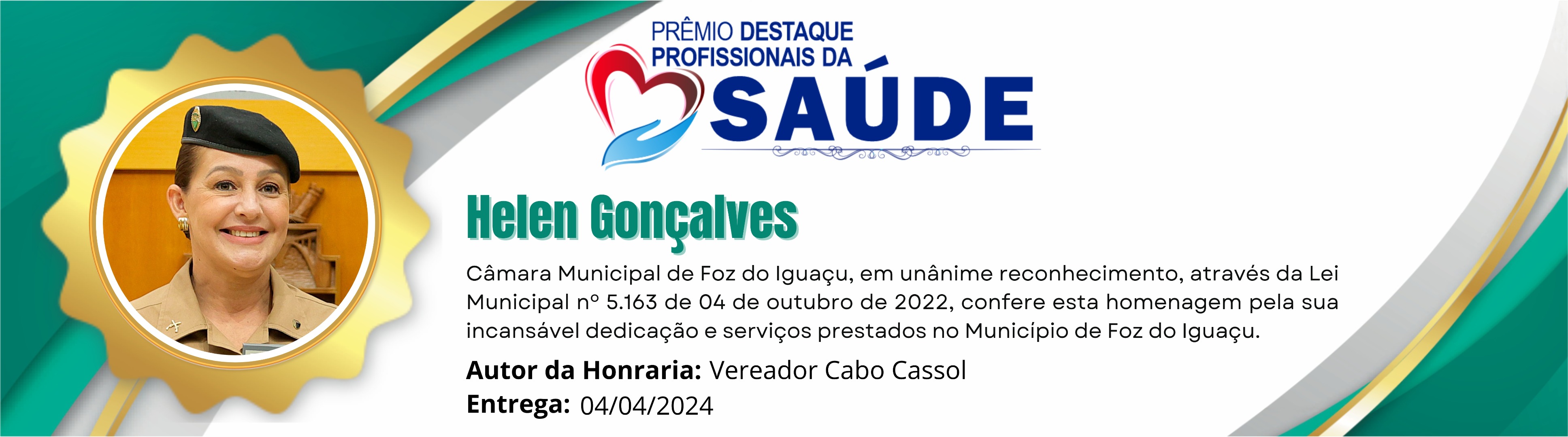 Câmara Municipal de Foz do Iguaçu, em unânime reconhecimento, através da Lei Municipal nº 5.163 de 04 de outubro de 2022, confere esta homenagem pela incansável dedicação e serviços prestados no Município de Foz do Iguaçu.