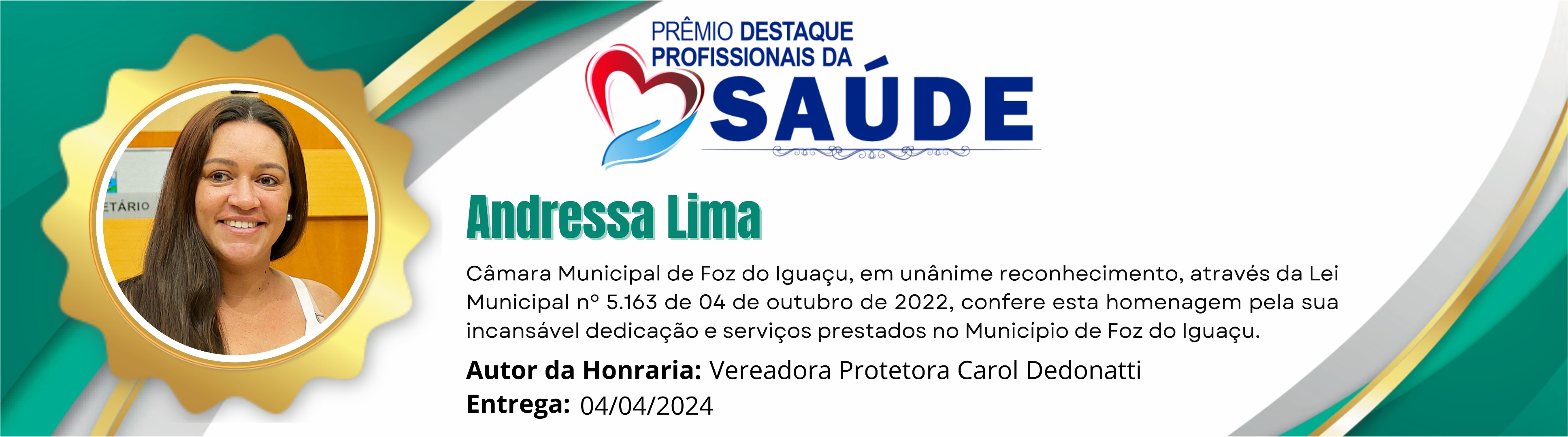 Câmara Municipal de Foz do Iguaçu, em unânime reconhecimento, através da Lei Municipal nº 5.163 de 04 de outubro de 2022, confere esta homenagem pela sua incansável dedicação e serviços prestados no Município de Foz do Iguaçu.