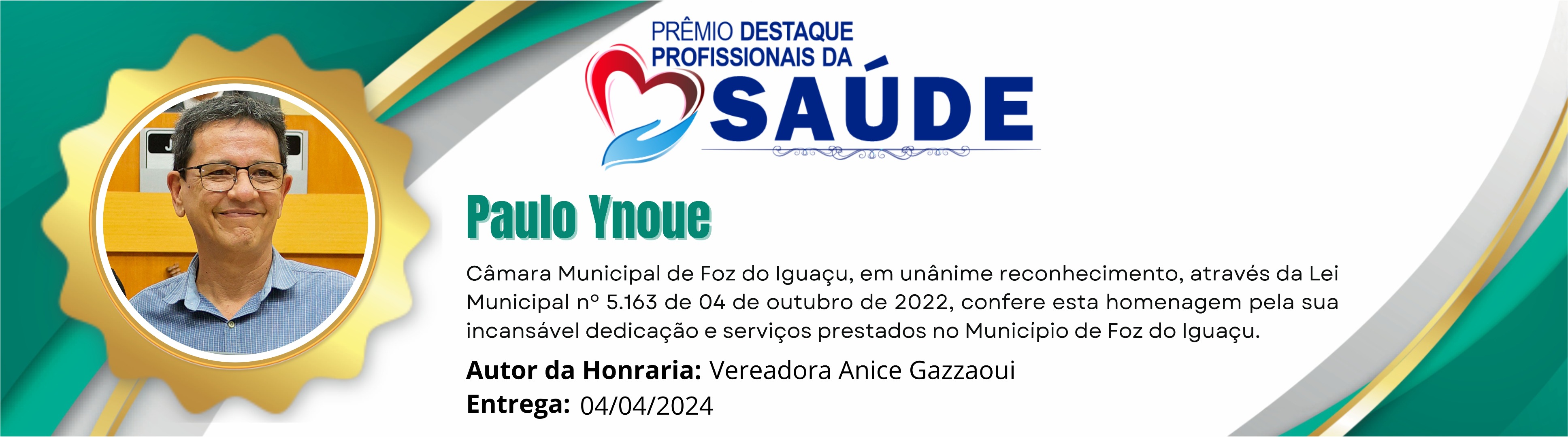 Câmara Municipal de Foz do Iguaçu, em unânime reconhecimento, através da Lei Municipal nº 5.163 de 04 de outubro de 2022, confere esta homenagem pela sua incansável dedicação e serviços prestados no Município de Foz do Iguaçu.