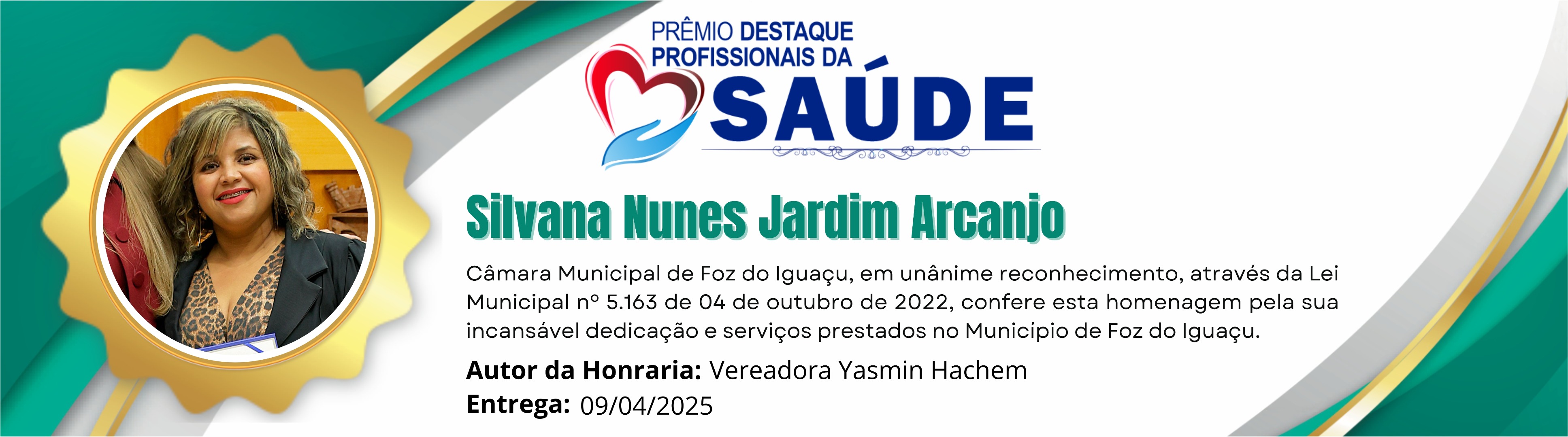 Câmara Municipal de Foz do Iguaçu, em unânime reconhecimento, através da Lei Municipal nº 5.163 de 04 de outubro de 2022, confere esta homenagem pela sua incansável dedicação e serviços prestados no Município de Foz do Iguaçu.
