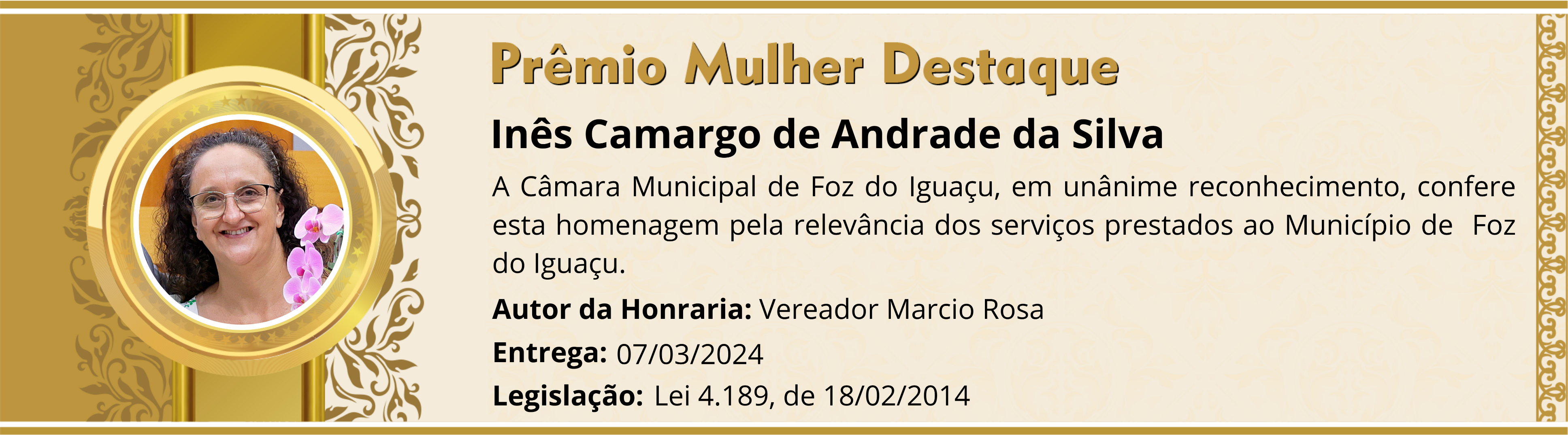 A Câmara Municipal de Foz do Iguaçu, em unânime reconhecimento, confere esta homenagem pela relevância dos serviços prestados ao Município de Foz do Iguaçu.