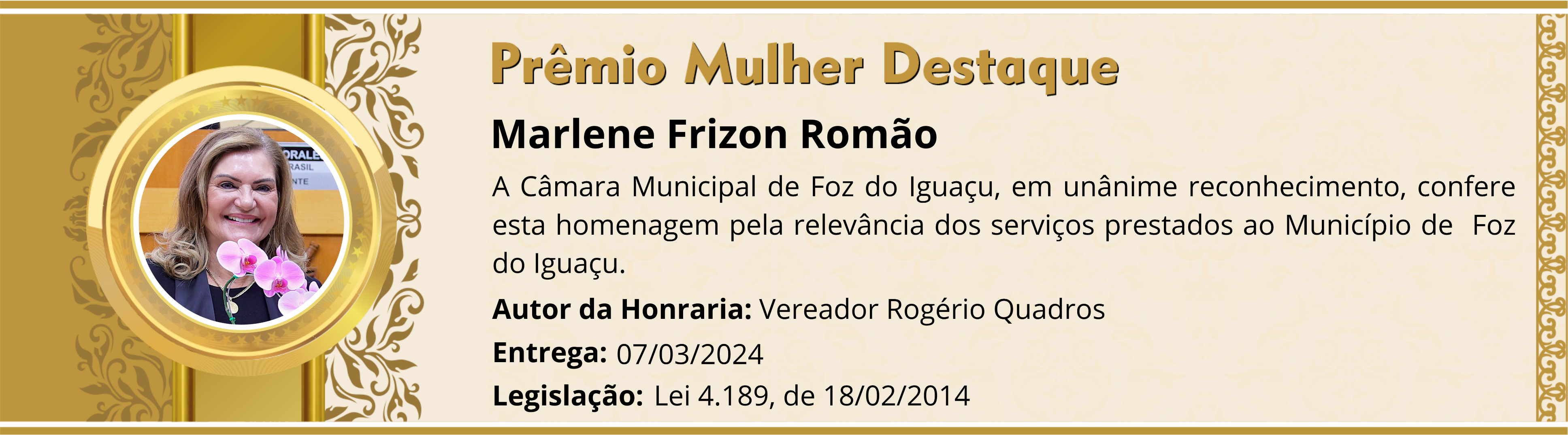 A Câmara Municipal de Foz do Iguaçu, em unânime reconhecimento, confere esta homenagem pela relevância dos serviços prestados ao Município de Foz do Iguaçu.