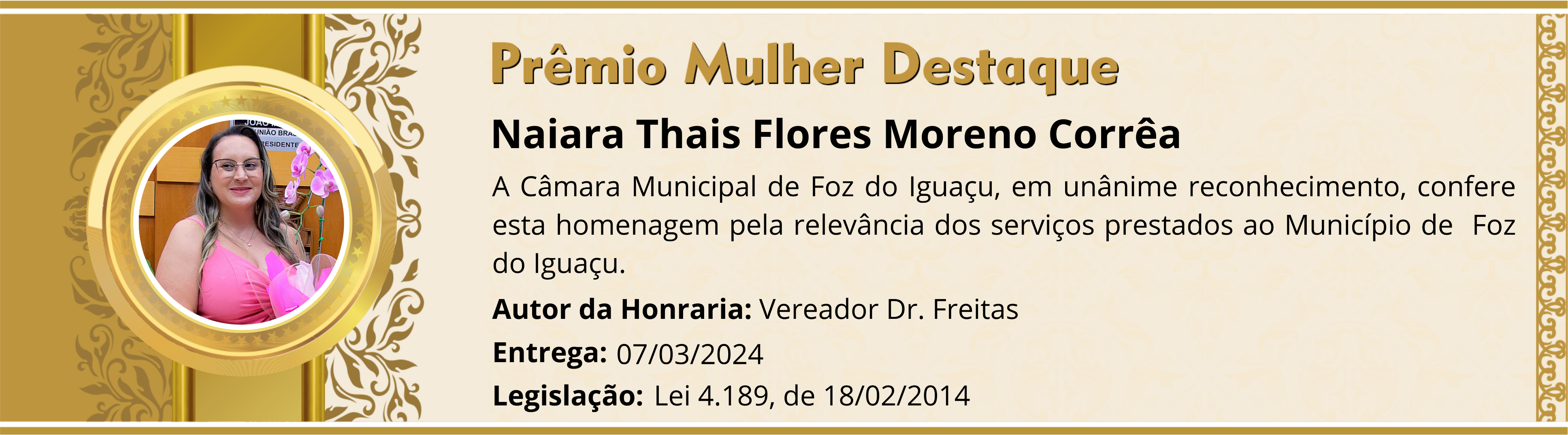 A Câmara Municipal de Foz do Iguaçu, em unânime reconhecimento, confere esta homenagem pela relevância dos serviços prestados ao Município de Foz do Iguaçu.