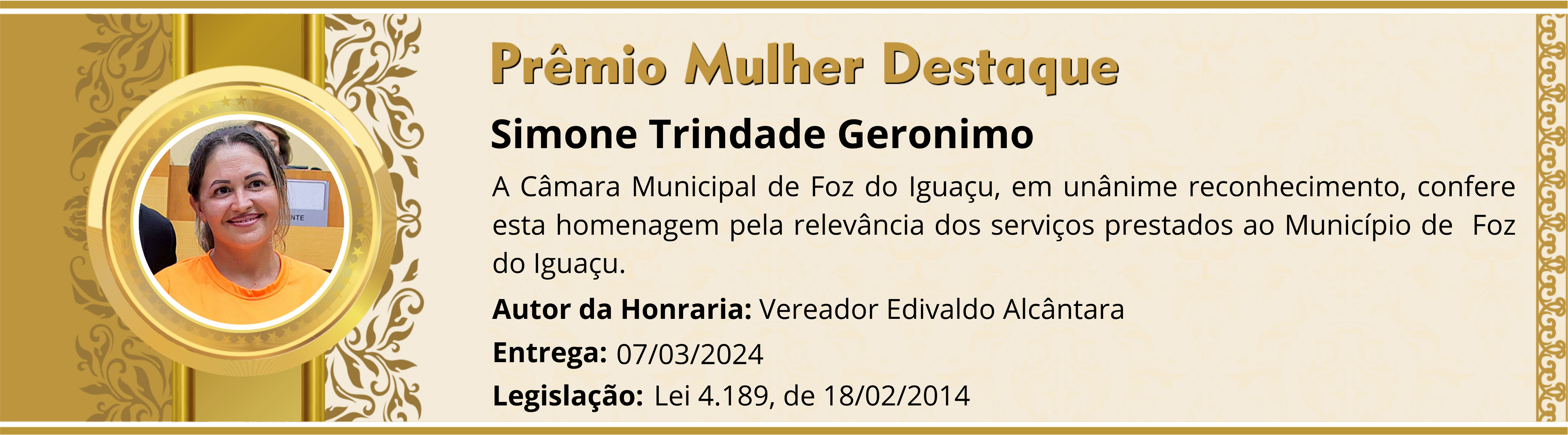 A Câmara Municipal de Foz do Iguaçu, em unânime reconhecimento, confere esta homenagem pela relevância dos serviços prestados ao Município de Foz do Iguaçu.