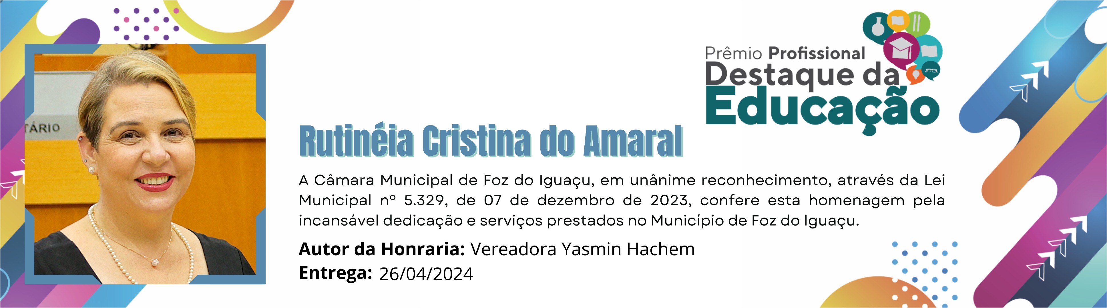 A Câmara Municipal de Foz do Iguaçu, em unânime reconhecimento, através da Lei Municipal nº 5.329, de 07 de dezembro de 2023, confere esta homenagem pela incansável dedicação e serviços prestados no Município de Foz do Iguaçu.