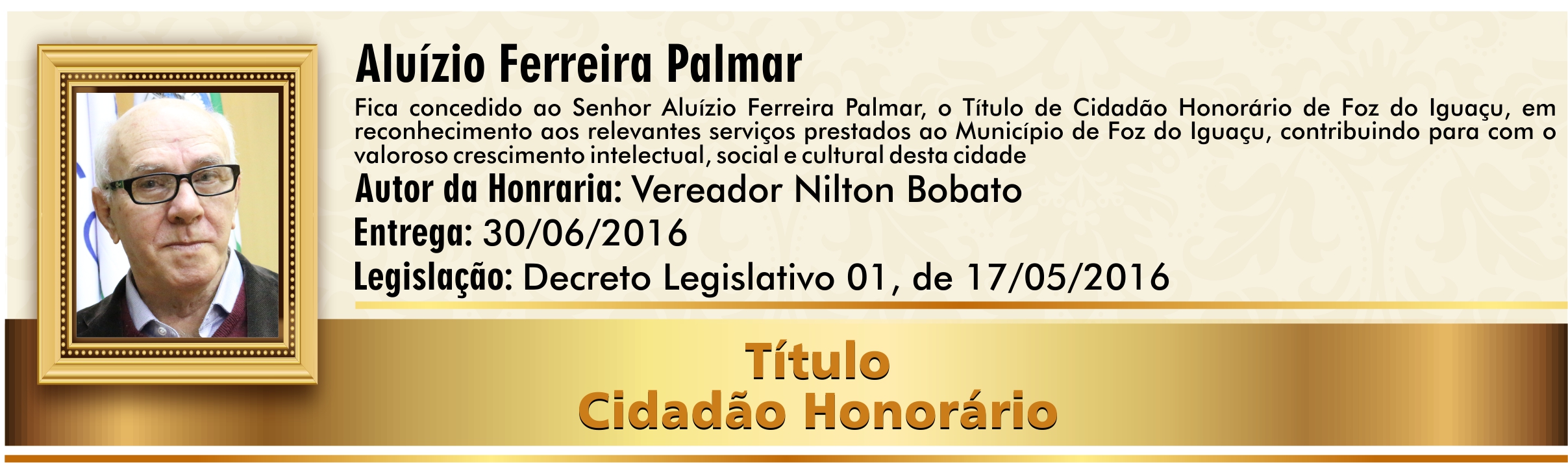 Em reconhecimento aos relevantes serviços prestados ao Município de Foz do Iguaçu, contribuindo para com o valoroso crescimento intelectual, social e cultural desta cidade