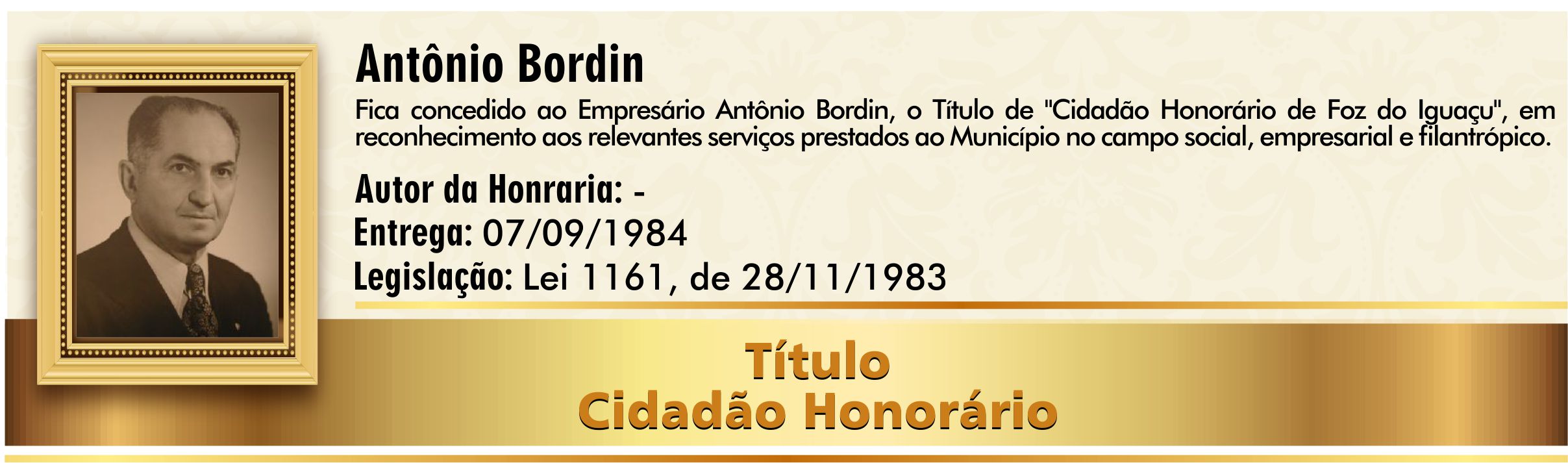 Em reconhecimento aos relevantes serviços prestados ao Município no campo social, empresarial e filantrópico.