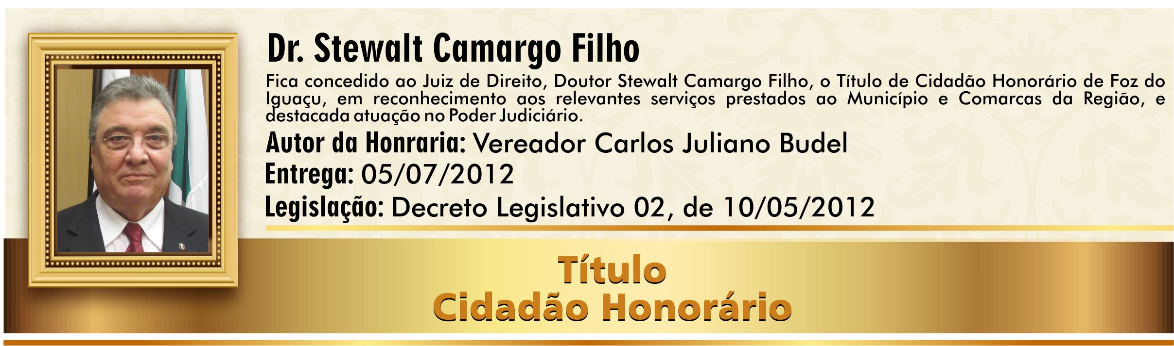 Em reconhecimento aos relevantes serviços prestados ao Município e Comarcas da Região, e destacada atuação no Poder Judiciário.