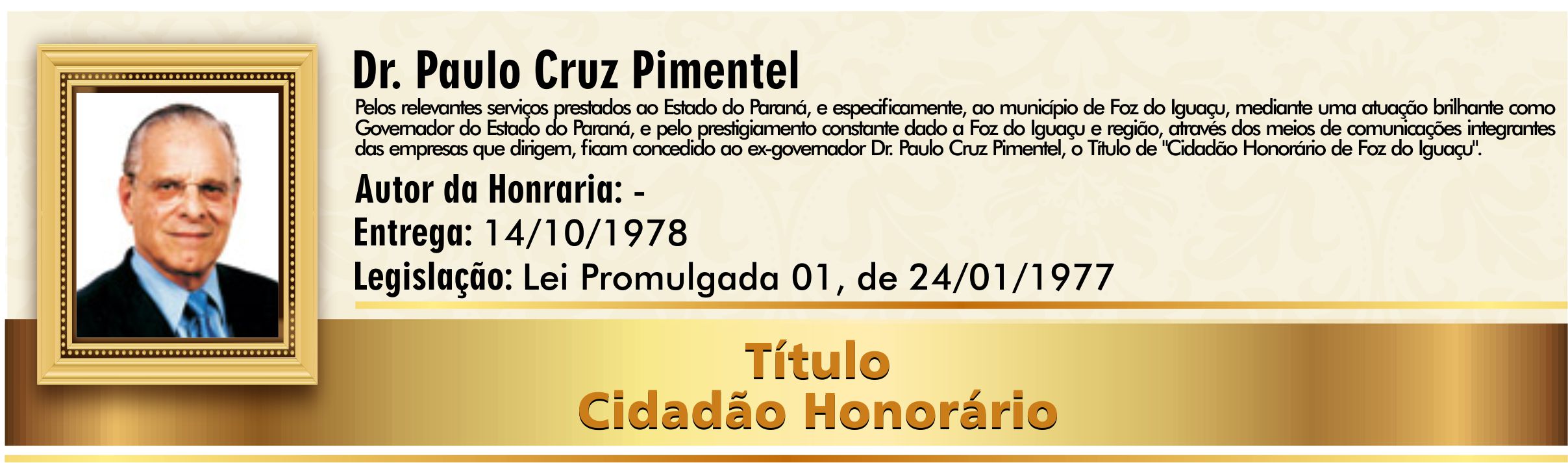 Pelos relevantes serviços prestados ao Estado do Paraná, e especificamente, ao município de Foz do Iguaçu, mediante uma atuação brilhante como Governador do Estado do Paraná, e pelo prestigiamento constante dado a Foz do Iguaçu e região, através dos meios de comunicações integrantes das empresas que dirigem.