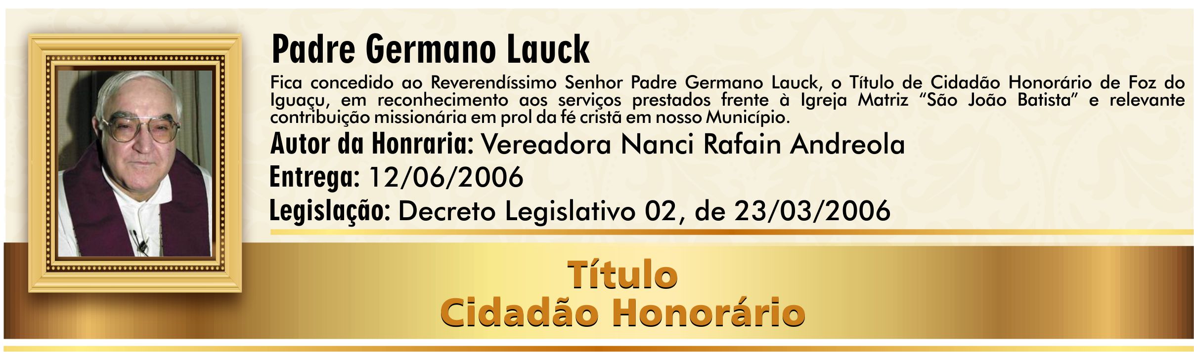 Em reconhecimento aos serviços prestados frente à Igreja Matriz “São João Batista” e relevante contribuição missionária em prol da fé cristã em nosso Município.