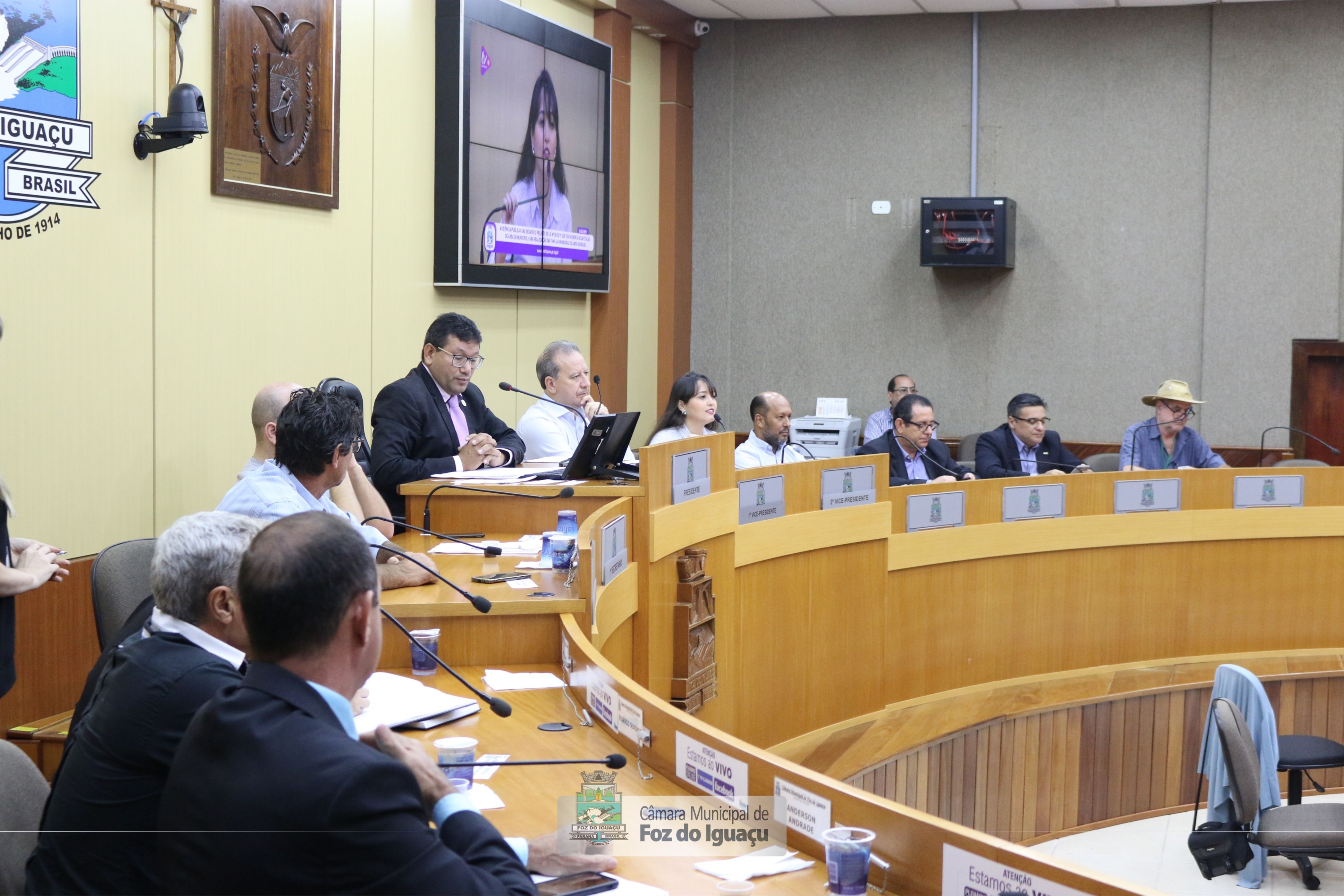 Vereadores e autoridades componentes da mesa na Audiência Pública que tratou sobre a liberação do Arroio Dourado - 24/04/2019