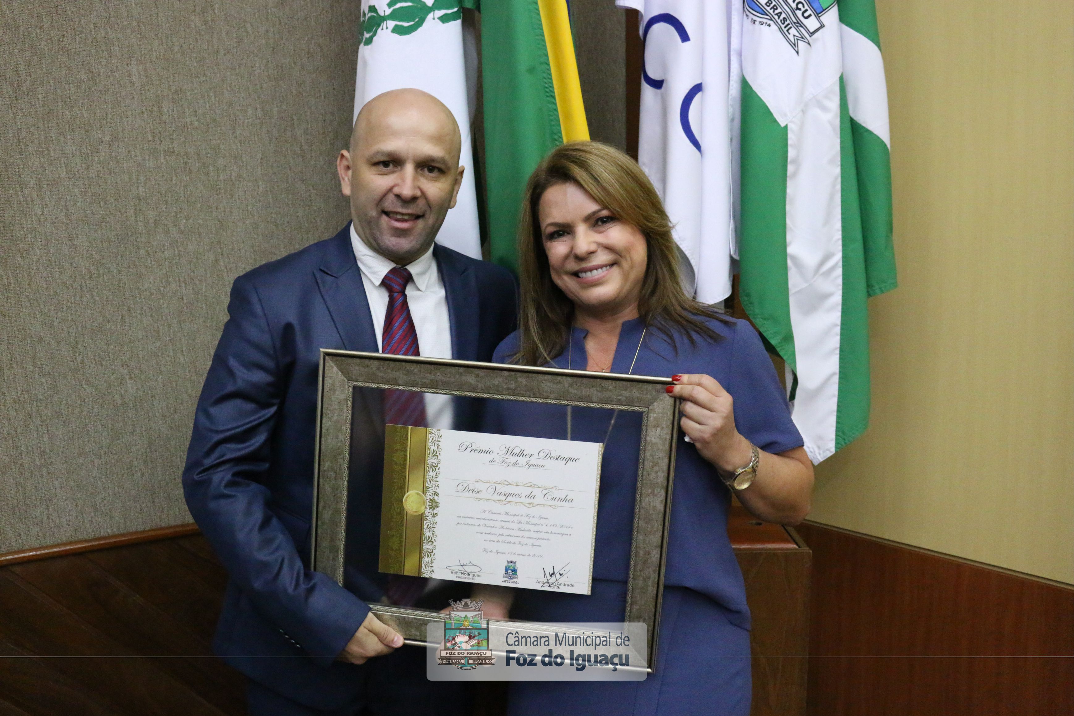 Vereador Anderson Andrade (PSC) e sua homenageada, Deise Vasques da Cunha