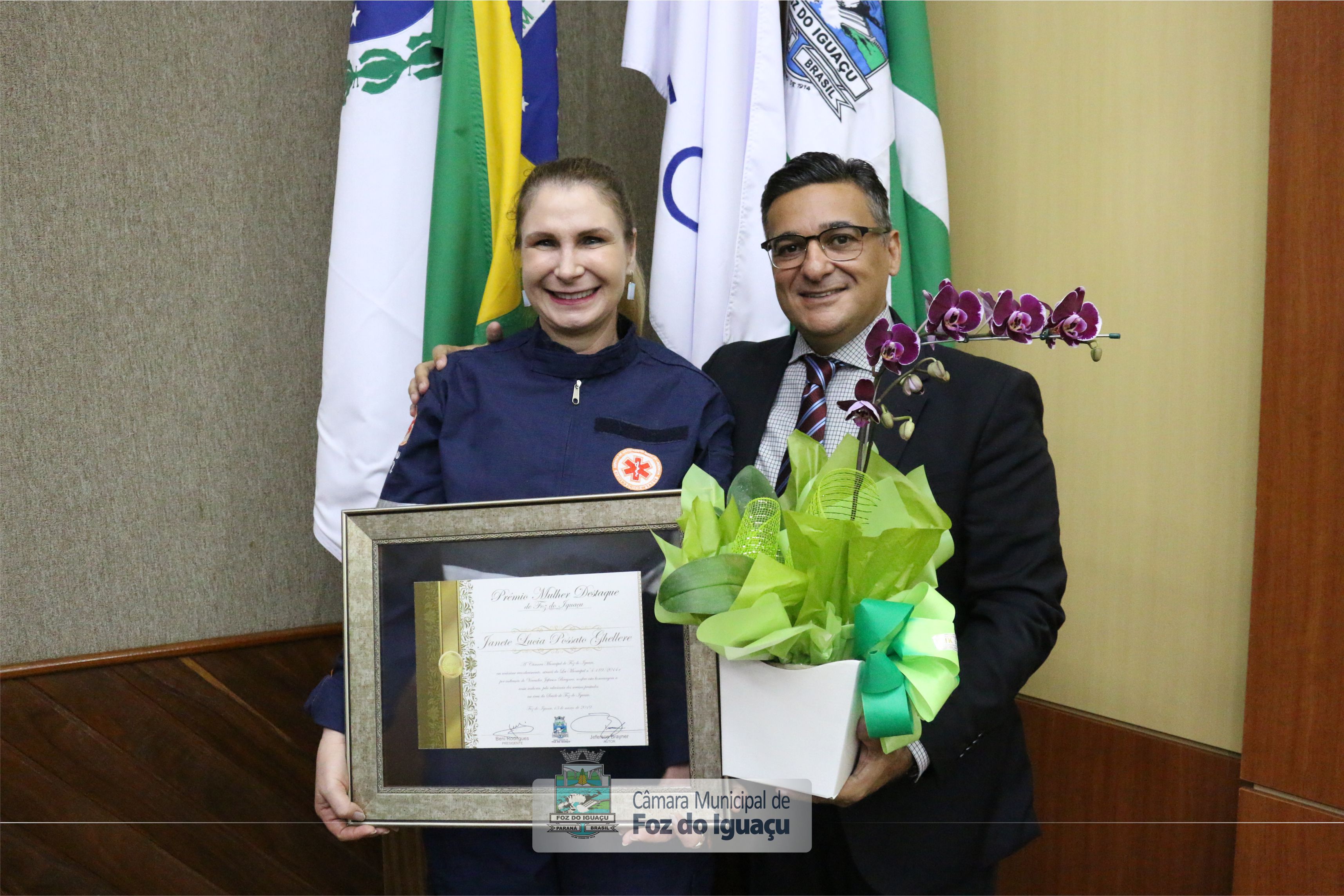 Vereador Jeferson Brayner (PRB) e sua homenageada, Janete Lúcia Possato Ghellere